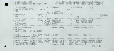 Поисковики обнаружили среди костных остатков часы и солдатский медальон. В расколотом медальоне лежала полуистлевшая записка, где, к счастью, сохранился расплывчатый текст: «Гидрат Аркадий Антонович, гор. Гусь-Хрустальный, «пос. Красный… ул. Курская, Гидрат Валентине – живи счастливо. Аркадий.»