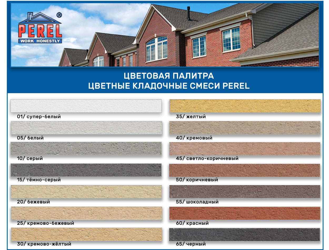 Качественная цветная кладочная смесь для кирпича кладочная смесь Perel представляет современный материал, который используют для создания декоративных стен, отделки фасадов и внутренних помещений. Составы содержат специальные компоненты, которые обеспечивают прочность и долговечность соединений. Используемые в смесях пигменты гарантируют яркие устойчивые цвета.