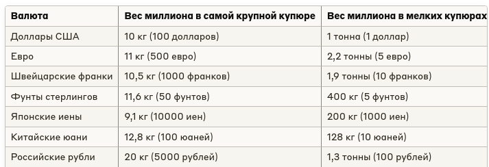 Как видим, разброс веса в зависимости от номинала и валюты огромный - от 9 кг до 2 тонн! В среднем миллион долларов, евро или франков в крупных купюрах будет весить около 10 кг. А вот миллион в мелких купюрах может потянуть на сотни килограмм или даже тонны.