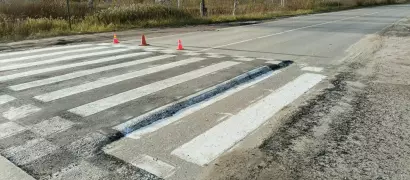 На улице Транспортная, напротив магазина "Виктория" через дорогу положили пешеходный переход-барьер. Переход служит одновременно для автомобилей искусственной неровностью с целью снизить скорость автомобиля перед пешеходным переходом. Но, по какой-то причине, пешеходного перехода хватило не на всю ширину дорогу. А разметку уже нанесли.