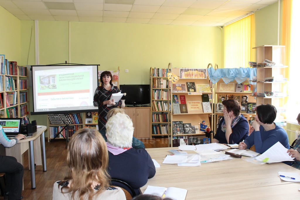 Библиотекари поделились своим опытом работы по обслуживанию людей с ограниченными возможностями, наметили дальнейшие пути взаимного сотрудничества, в том числе со специалистами Владимирской областной специальной библиотеки и местным отделением Всероссийского общества слепых.