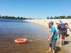 В завершение мероприятия спасатели устроили показательное занятие — спасение человека из воды, и дети с удовольствием приняли в этом участие. Все желающие смогли бросить спасательный круг «утопающему» и вытянуть его на берег.