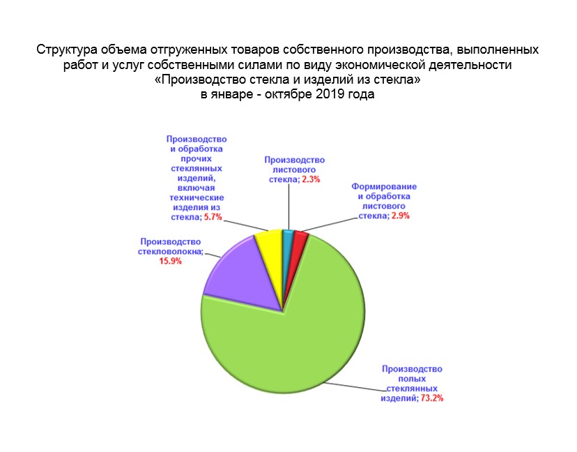 Объем отгруженных товаров собственного производства, выполненных работ и услуг собственными силами по виду экономической деятельности «Производство стекла и изделий из стекла» за 10 месяцев 2019 года составил 20,8 млрд рублей, что в действующих ценах на 16,3 процента больше, чем за соответствующий период предыдущего года.