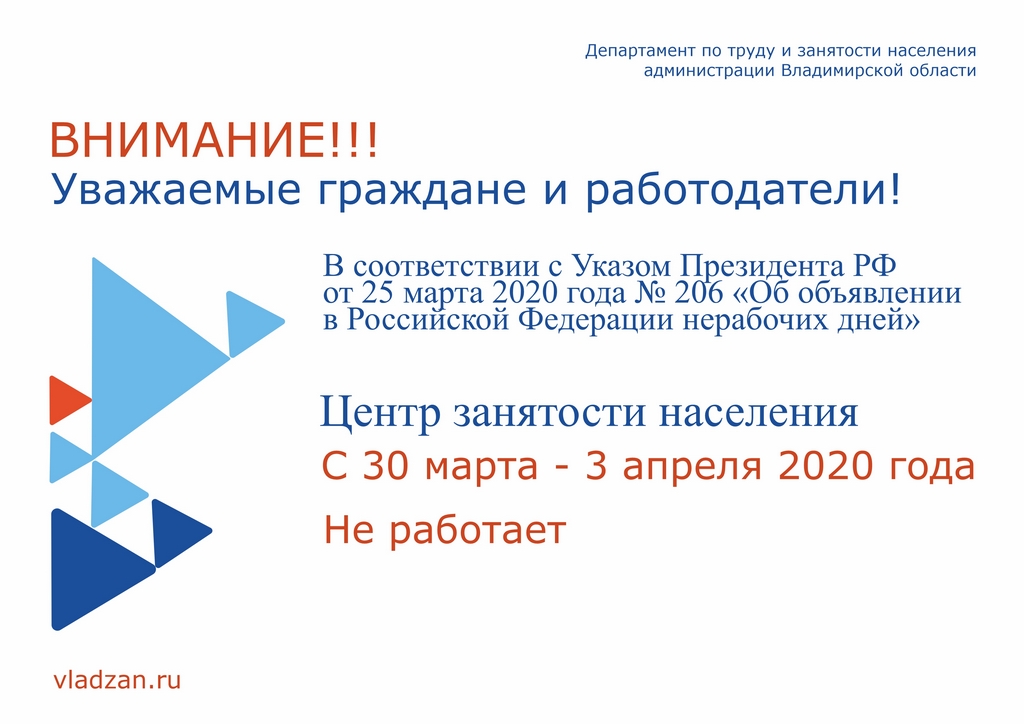 С 30 марта по 3 апреля 2020 года в соответствии с Указом Президента РФ от 25 марта 2020 г. № 206 «Об объявлении в Российской Федерации нерабочих дней» Центр занятости населения не работа.