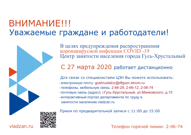 27 марта ЦЗН работает дистанционно. Для связи со специалистами центра можно воспользоваться электронной почтой, мобильной или почтовой связью, интерактивным порталом департамента по труду и занятости населения администрации Владимирской области.