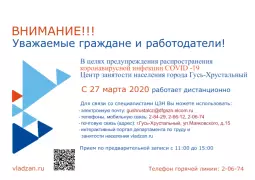 Гусь-Хрустальный центр занятости населения перешел на дистанционный режим работы. Следующая неделя для ЦЗН объявлена не