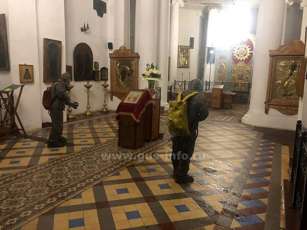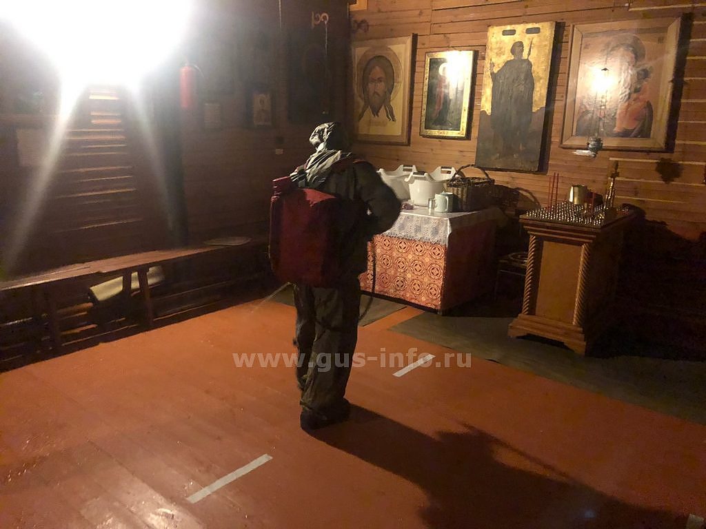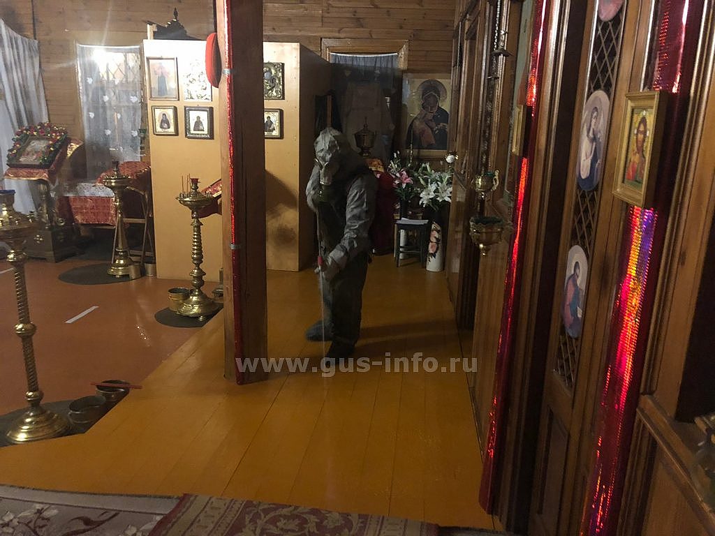 18-го апреля в преддверии проведения мероприятий по празднованию Светлой Пасхи сотрудники МЧС провели работу по дезобработке Свято-Троицкого храма города Гусь-Хрустального и храма Серафима Саровского в городе Курлово. Так же обработка проводилась на следующий день после проведения богослужений. Работы проводились с использованием ранцевых установок. Сотрудники МЧС работали в индивидуальных средствах защиты – противогазах и защитных костюмах Л-1.