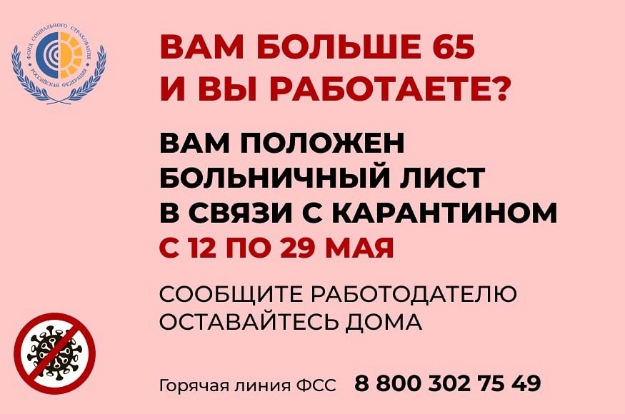 До 29 мая 2020 года продлено действие механизма оформления листков нетрудоспособности в случае карантина застрахованным лицам в возрасте 65 лет и старше, сообщает Владимирское региональное отделение Фонда социального страхования России. Это сделано в соответствии с постановлением Правительства РФ от 15.05.2020 № 683 «О внесении изменения во Временные правила оформления листков нетрудоспособности, назначения и выплаты пособий по временной нетрудоспособности в случае карантина застрахованным лицам в возрасте 65 лет и старше».