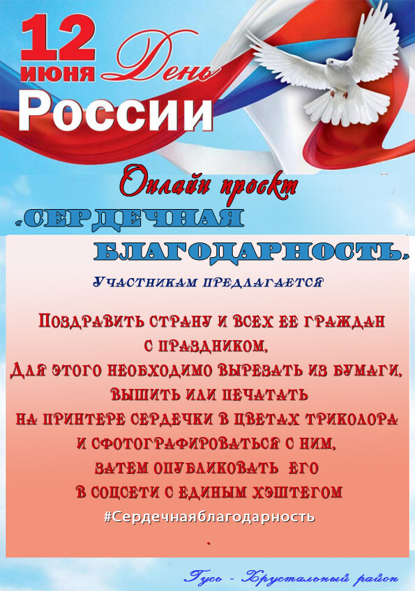 Приглашаем всех желающих присоединиться к всероссийской онлайн-акции «Сердечная благодарность». Для этого требуется вырезать из бумаги, вышить или напечатать на принтере сердечки в цветах триколора, сфотографироваться с ними, затем выложить фото в социальной сети (5-12 июня) с хэштегом #СердечнаяБлагодарность #РоссияРодинаЛюбовь.