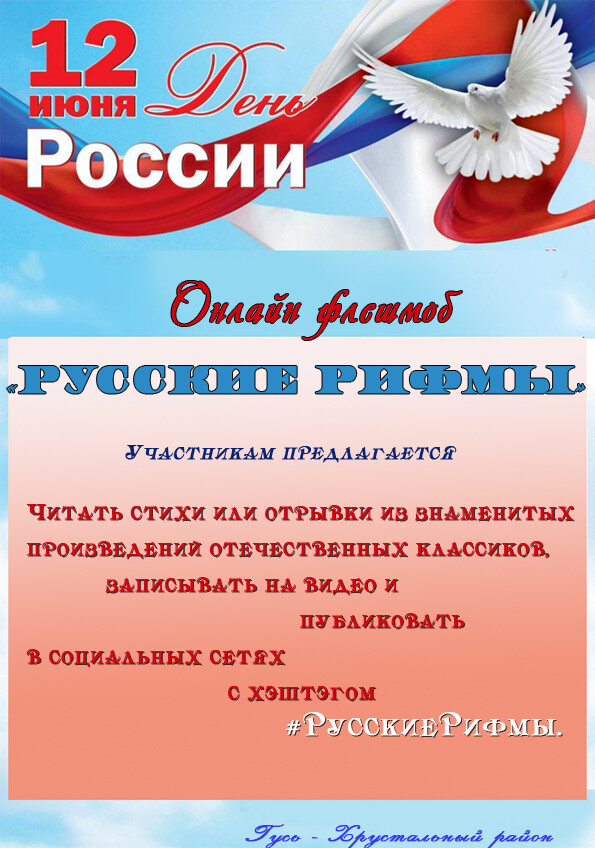 Приближается День России, и в преддверии этого праздника отдел по культуре, физкультуре и спорту, молодёжной и социальной политике предлагает жителям Гусь-Хрустального района принять участие сразу в двух онлайн акциях: «Русское Слово» и «Русские Рифмы».