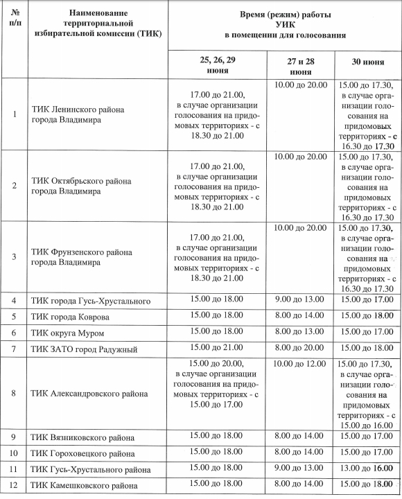 Графики работы УИК с 25 по 30 июня в каждом районе области установлены территориальными избирательными комиссиями, они будут размещены на сайтах ТИКов, а также на сайте облизбиркома vladimir.izbirkom.ru в разделе «Общероссийское голосование». 1 июля голосование будет проходить на избирательных участках в привычном режиме с 8:00 до 20:00./p>