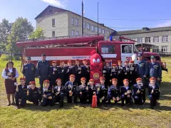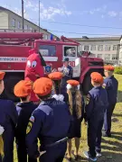 Встретил будущих кадетов небезызвестный помощник-доброволец, ростовая кукла Кузьма Пожаркин. Яркий и всегда позитивный Кузьма рассказал ребятам об огнетушителе и вручил всем памятки-флажки.