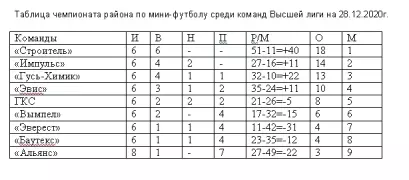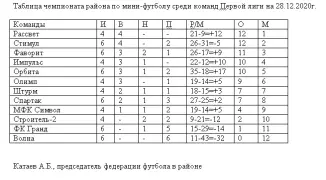 В прошедшие выходные дни состоялись очередные календарные матчи чемпионата района по мини-футболу. В высшей лиге в сыгранных матчах были зафиксированы следующие результаты: