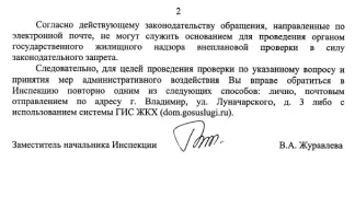 Первой на обращение отозвалась Гусь-Хрустальная межрайонная прокуратура Владимирской области, которая уведомила заявителя, что согласно части 3 статьи 8 Федерального Закона от 02 мая 2006 г. N 59-ФЗ "О порядке рассмотрения обращений граждан Российской Федерации" его заявление перенаправлено в Государственную жилищную инспекцию Владимирской области. Что по закону является весьма правомочным, хотя для жителей было бы важно получить правовую оценку именно прокуратуры. Да Бог с ним.