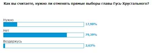 Недавно жители нашего города узнали о предложении инициативной группы об отмене прямых выборов мэра Гусь-Хрустального. На сайте «Гусь-Инфо» был проведён опрос о необходимости таких перемен, в котором приняли участие 228 человек. Результаты получились следующие: 79% высказались за сохранение прямых выборов, 18% – за их отмену, остальные участники, 3% – воздержались. Опрос показал отношение населения к отмене механизма непосредственной демократии ради повышения уровня компетентности главы города и эффективности муниципального управления.