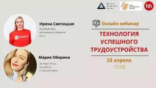 Во время трехчасового вебинара руководитель молодежного направления HeadHunter Ирина Святицкая и эксперт HeadHunter по работе с соискателями Мария Оборина расскажут, как составлять резюме молодым специалистам без опыта работы, как искать работу, успешно проходить собеседования и выстраивать индивидуальную карьерную стратегию.