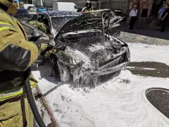 В 12-10 17 июня 2021 года в Главное управление МЧС России по Владимирской области поступило сообщение о пожаре легкового автомобиля по адресу: г. Гусь-Хрустальный, ул. Рудницкая, у д. 3. Пожарно-спасательные подразделения оперативно выехали к месту пожара. На момент прибытия подразделений наблюдалось открытое горение моторного отсека автомобиля. Пожарные не допустили распространения огня на весь автомобиль и ликвидировали пожар на площади 1 кв. м. Погибших и пострадавших нет. К ликвидации пожара привлекалось 2 единицы техники, 6 человек личного состава. Дознаватели МЧС России устанавливают причину пожара.