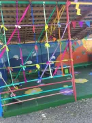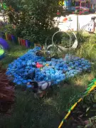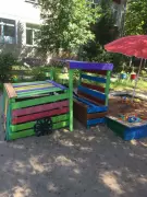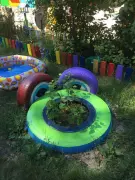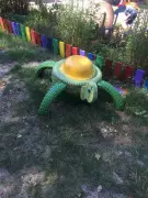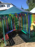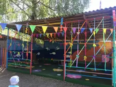 В летний период ребята много времени проводят на участке, поэтому самый большой объем работ родители выполнили именно здесь. Совместно с родительским комитетом была выбрана тема оформления «Африка». Малышей встречает львенок из всеми любимого мультфильма, рядом с которым расположилась черепаха и мини-прудик с лебедями. Наша веранда, яркий остров посреди океана, а пол – произведение искусства, не меньше! Мальчики с удовольствием проводят время за рулем автомобиля-песочницы, а девочки лепят в кузове куличики и пирожные.