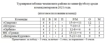 В субботу, 9 октября, в спорткомплексе имени Ю.Н. Каперского в г. Курлово состоялись матчи чемпионата района по мини-футболу среди команд ветеранов. В соревнованиях приняли участие 5 команд. В результате проведенных игр турнира первое место заняли футболисты команды «Спартак» г. Гусь-Хрустальный. На втором месте красноэховский «Штурм» и замкнули тройку призеров футболисты команды «Орбита».