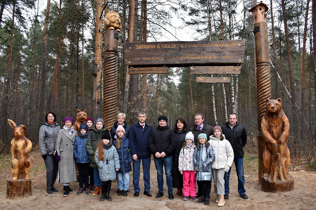 27 октября в Гусь-Хрустальном состоялось торжественное открытие входной композиции лесопарка «Сказка». Спонсором работ выступил благотворительный Фонд «Шаг в жизнь», представители которого также приехали на мероприятие – обратная связь с администрацией города и его жителями являются неотъемлемой частью деятельности Фонда, что позволяет наладить коммуникацию для дальнейшего плодотворного сотрудничества.
