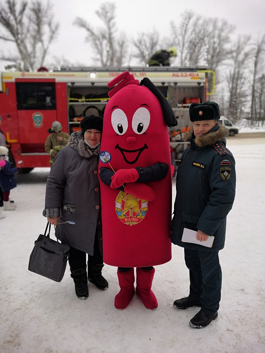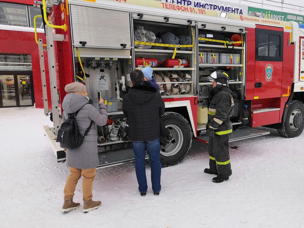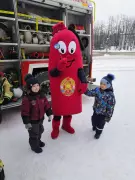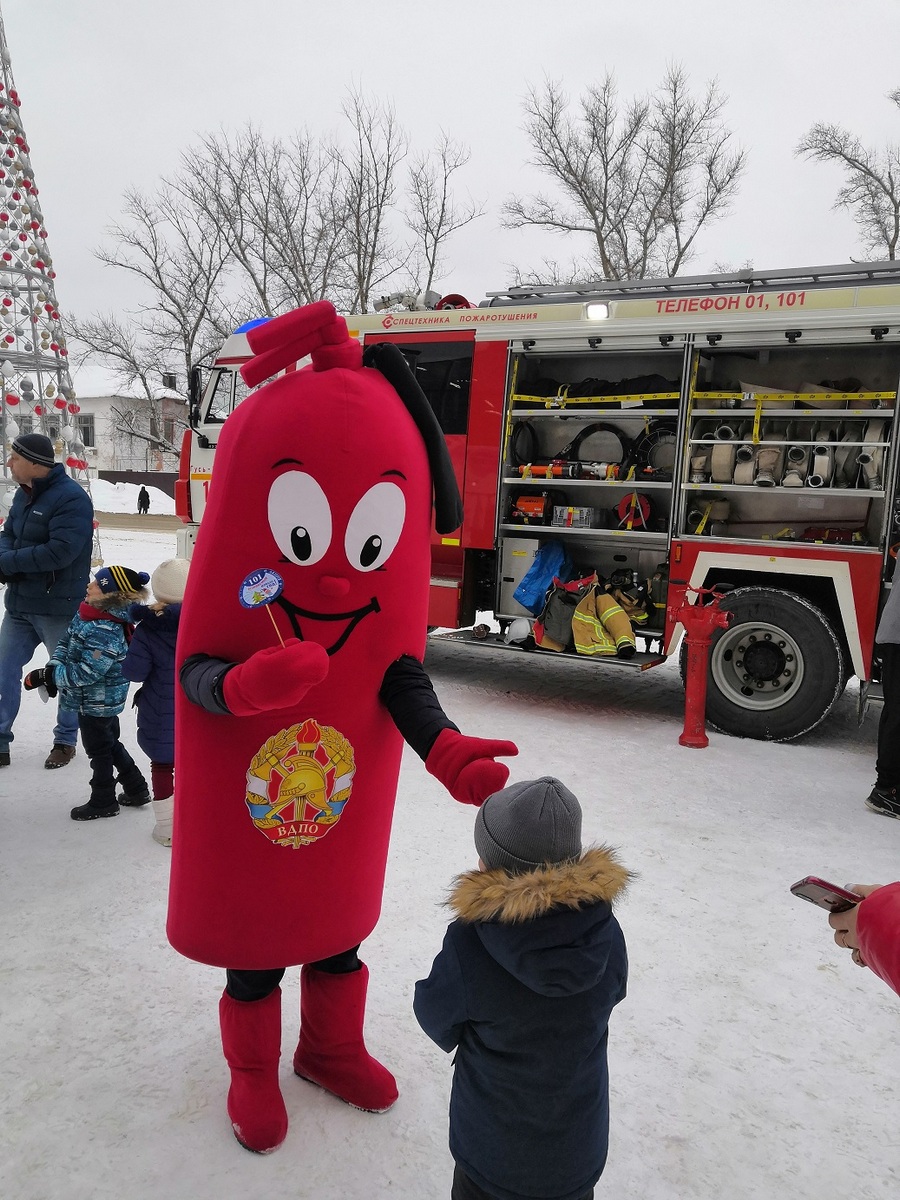 У магазина развернулась пожарная автоцистерна, сотрудники пожарно-спасательного гарнизона рассказывали всем желающим об устройстве спецавтомобиля, а символ пожарных – ростовая кукла-огнетушитель Кузьма Пожаркин – раздавал всем памятки с номером вызова пожарных 101.