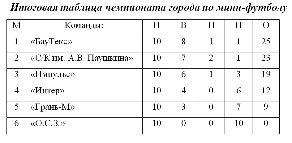 В заключительном календарном игровом дне, в первом матче, команда «Грань-М» добыла свою третью победу в соревновании, победив команду «Интер» 8:5. Во второй игре коллективу «БауТекс» необходимо было побеждать команду «О.С.З.», чтобы претендовать на первую строчку в таблице. Более чем уверенная победа футболистов «БауТекса» 23:0. Кульминацией всего соревнования стала игра между командами «С/К им. А.В. Паушкина» - «Импульс». В традиционно острой борьбе между этими коллективами данный матч так и не выявил победителя 3:3. Команда «с/к им А.В. Паушкина» на последних секундах упускает шанс на победу, и становится лишь серебряным призером чемпионата города по мини - футболу. Третье место заняла команда «Импульс». А победителями чемпионата города по мини-футболу впервые стала команда «БауТекс».