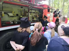В рамках учений были проверены пожарные краны, установлена автоцистерна на водоисточник для забора воды. Дети смогли наблюдать подачу воды из лафетного ствола и познакомиться с экипировкой пожарного автомобиля.
