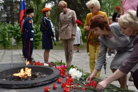 Митинг памяти у мемориала завершился минутой молчания и возложением цветов и венков к Вечному огню.
