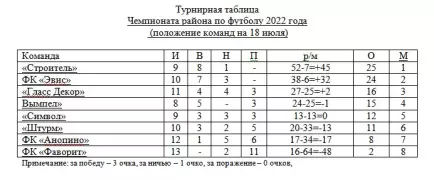 В субботу, 16 июля, состоялись очередные матчи чемпионата района по футболу. В г. Курлово «Символ» принимал золотковский «Фаворит». Матч завершился вничью. 1:1. В поселке Красный Октябрь местный «Гласс Декор» принимал ФК «Анопино». И здесь была зафиксирована ничья 2:2.