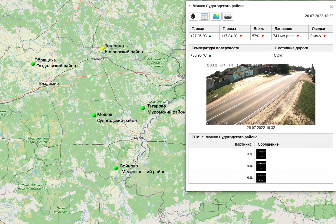 Во Владимирской области первые метеорологические системы мониторинга установили в 2020 году в селе Обращиха Суздальского района и селе Татарово Муромского района, что позволило получать оперативные данные о погодной обстановке, состоянии покрытия дороги и интенсивности движения на основных направлениях.