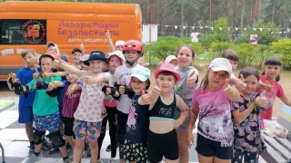 Отдыхающие в лагере дети были удивлены неожиданному и необычному визиту гостей, когда вслед за патрульным автомобилем ГИБДД на дорожке у ворот показался ярко оранжевый автомобиль Лаборатории безопасности.