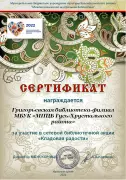 Так, в рамках Года народного искусства и нематериального культурного наследия народов России библиотека стала участником сетевой библиотечной акции «Кладовая радости», за что и получили достойный внимания сертификат. Организатор Акции – Муниципальное бюджетное учреждение культуры Красносулинского района «Межпоселенческая центральная библиотека» Детское отделение (Ростовская область, г. Красный Сулин).