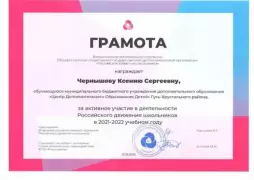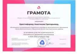 Также грамотами за активное участие в деятельности РДШ отмечены 12 активистов школ Гусь-Хрустального района, в том числе и учащиеся Муниципального бюджетного учреждения дополнительного образования "Центр Дополнительного Образования Детей" Гусь-Хрустального района.