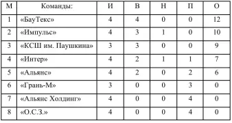 4 февраля прошел пятый тур чемпионата города по мини-футболу. Футболисты «Импульса» и «Альянса», сыграв в открытый футбол, забили на двоих пятнадцать мячей. Итоговый счет на табло 10:5 победа команды «Импульс». Во втором матче команда «КСШ им. А.В. Паушкина» одержала свою третью победу, нанеся поражение команде «Альянс Холдинг» 13:5. В заключительной игре тура «БауТекс» разгромили «Интер» 14:2.