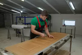 Рабочую группу Владимира Киселева утром встретили на предприятии «Русская дверная мануфактура». Производство совсем молодое: появилось на свет аккурат с приходом пандемии. На месте бывшего болота и подлеска энтузиасты построили производственные корпуса, в цеха пришли рабочие, в кабинеты – грамотные руководители, которые нашли надежных партнеров и рынки сбыта. Как итог – активно развивающееся предприятие, которое ежегодно наращивает объемы производства и в условиях санкций.