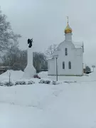 Образ святого покровителя воинов, защитника всех православных христиан от видимых и невидимых врагов венчает теперь обелиск у храма.