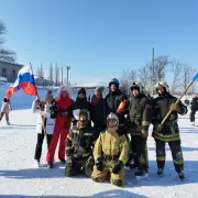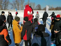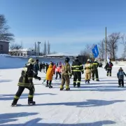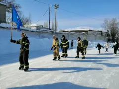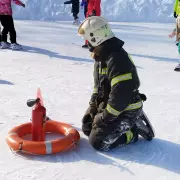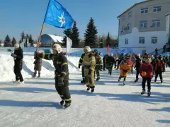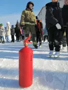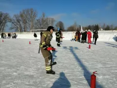 Второй конкурс - пожарная эстафета, был немного сложнее, необходимо было по команде старт, по очереди объехать «змейкой» стоящие на льду огнетушители и на финише привести углекислотный огнетушитель в действие, потушив условный огонь. Команда, показавшая лучший результат получила сладкие призы.
