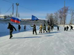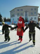 Начали с поздравлений для мужчин и в первую очередь слова поздравлений звучали для самых сильных и смелых виновников торжества доблестных пожарных. Спасатели на коньках, вместе с Кузьмой Пожаркиным, ростовой куклой в виде огнетушителя взявшись за пожарный рукав, и собрав всех присутствующих детей и взрослых совершили круг почета на льду.