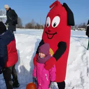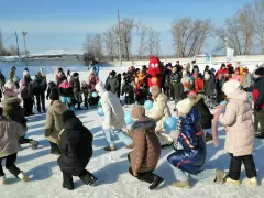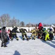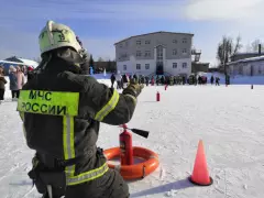 Первым разминочным конкурсом стало перетягивание пожарного рукава, команда Кузьмы Пожаркина и команда МЧС боролись на льду, соревнуясь в умении работать командой, результат 1/1, победила дружба.