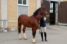 Двухлетний жеребец огненно-гнедой масти родился в Государственной заводской конюшне имени В.И. Фомина от лучших представителей редкой владимирской породы. Он уже номинировался на международные выставки и является одним из лучших образцов породы.