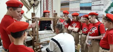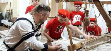 Очень понравилась ребятам экскурсия по русской избе. Здесь они не только узнали секреты русской печи, которая играла в доме главную роль, но и под руководством Андрея Сергеевича Агафонова сами попробовали ткать половики, которые являются неотъемлемым атрибутом жизни крестьян. Экскурсия прошла познавательно и с интересом: дети отгадывали загадки, играли на деревянных ложках, пробовали вытаскивать с печи чугун, качали колыбель, разглаживали рубелем ткань.