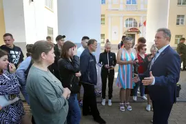 13 июня у Дома культуры молодёжи во Владимире прошла очередная отправка добровольцев в учебные подразделения Минобороны России. Более 20 наших земляков приняли решение служить в рядах Вооружённых сил России по контракту. Слова напутствия им сказали военный комиссар Владимирской области Юрий Гусаров, министр региональной безопасности Сергей Полузин, волонтёры, священнослужители, родные и друзья.