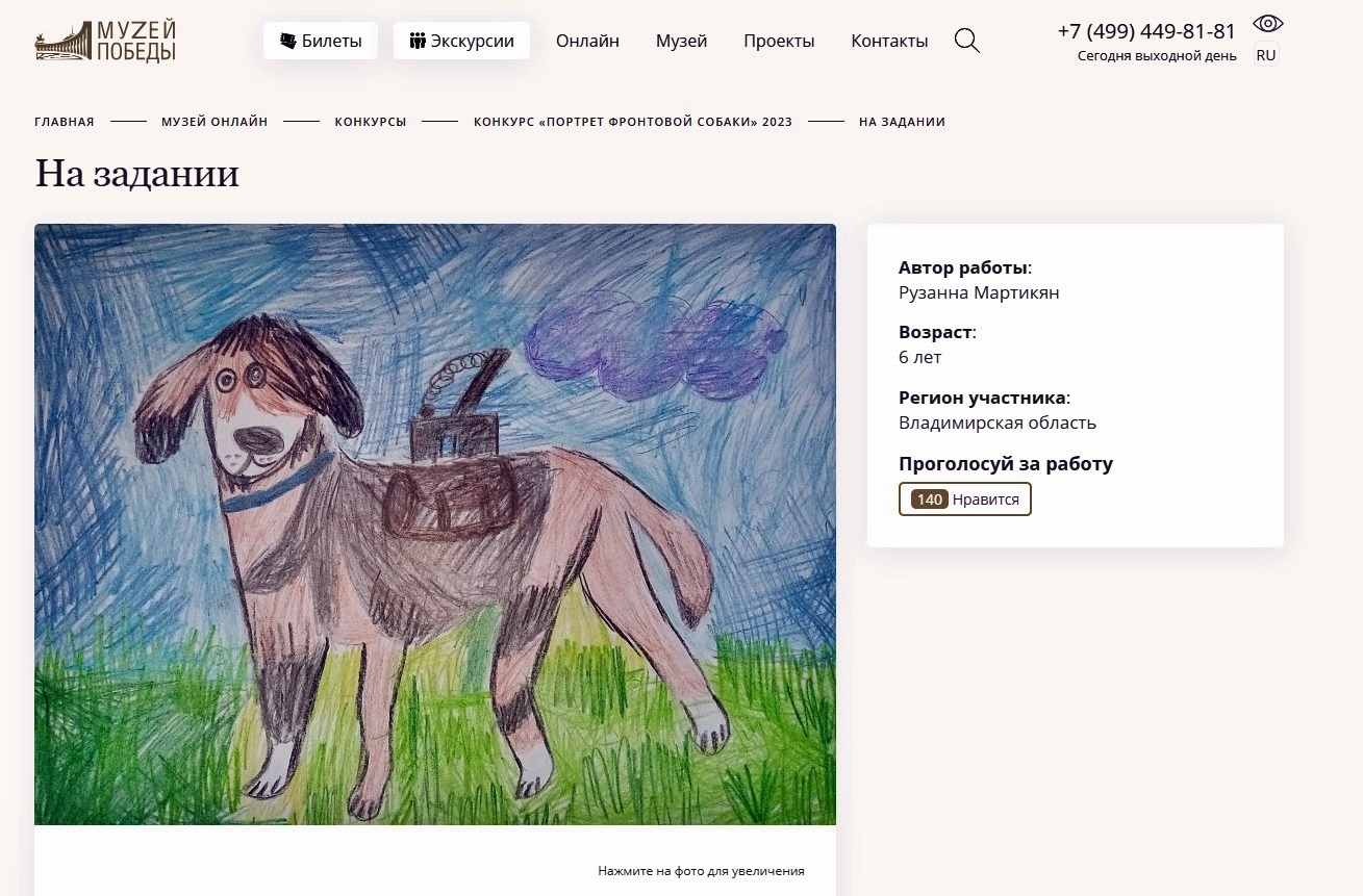 Рисунки жителей Владимирской области включены в виртуальную выставку «Портрет фронтовой собаки». Электронная экспозиция открылась на сайте московского Музея Победы. В неё вошло около 3 тысяч рисунков, присланных на международный творческий конкурс о подвигах четвероногих героев.