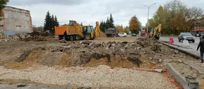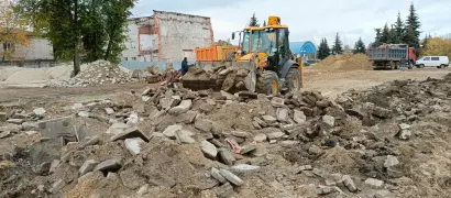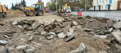Местные жители в недоумении, что старую и вполне добротную плитку снимают погрузчиком и вперемешку с грунтом просто увозят на свалку.