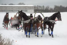 Действительно, несмотря на непростую дорогу, снег и холодный ветер на открытии фестиваля собралось множество людей. Помимо конных забав оба дня – 3 и 4 февраля – работала «сырмарка», проводились конкурсы, концерты и многое другое. Но, конечно, собрались люди сюда ради лошадей. Перед зрителями выступали экипажи из Москвы и Костромы, Архангельска и Вологды, из Владимирской и Ярославской областей в трех зачетах: паркур, фигурная и призовая езда. Грациозные орловские рысаки, мощные владимирские тяжеловозы и даже резвый вересковый фелл-пони – выход каждого участника на плац вызывал шквал аплодисментов и полный восторг.
