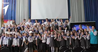 Право повязать галстуки будущим орлятам было предоставлено старшим товарищам орлят – активистам Движения Первых и старшеклассникам-наставникам.