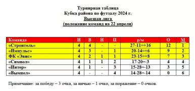 Без потерь этот игровой день удалось пройти лишь футболистам купреевского «Строителя». Они же единственные и возглавили турнирную таблицу турнира. Заключительные матчи соревнований состоятся 28 апреля.