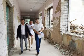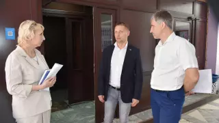 Начался визит заместителя губернатора области с осмотра ремонта здания МБУК «ЕСКЦ» (бывший ДМ «Хрустальный»). Здесь проходят работы по замене оконных блоков, капитальному ремонту отопления и кровли.