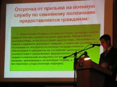 После просмотра видео фильма участники конференции отвечали на волнующие вопросы молодых людей и их родителей. Призывников волновали вопросы о прохождении альтернативной службы, разнице в службе по состоянию здоровья, зарплате военнослужащего, о том что делают с призывником после того как его увозят во Владимир на распределительный пункт и если у призывника выбор в какие вооруженные силы пойти служить.