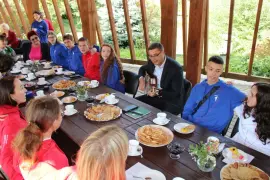 В завершение встречи ребята попросили Губернатора исполнить песню под гитару. Глава регионе не смог отказать молодым людям в просьбе и вместе с ними спел песню о дружбе «Ничего на свете лучше нету» из мультфильма «Бременские музыканты».